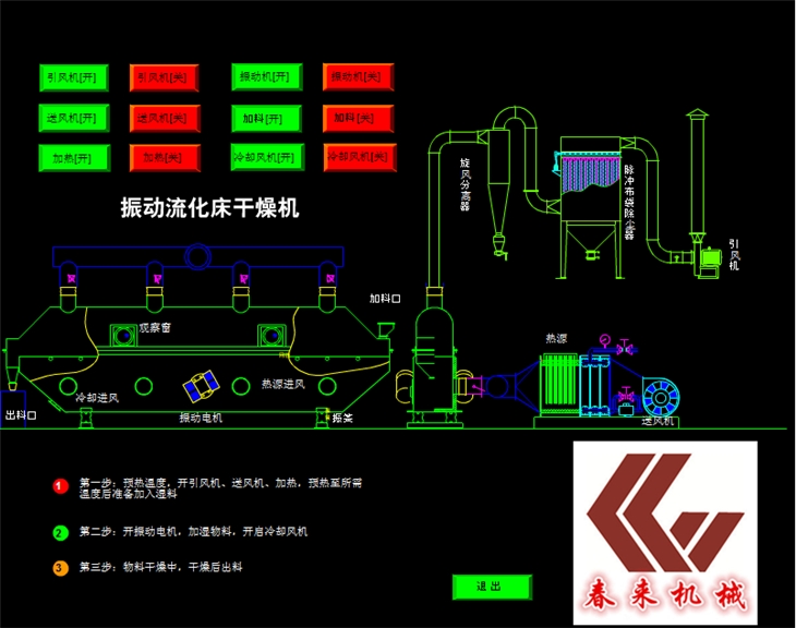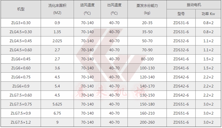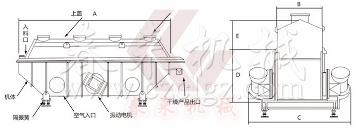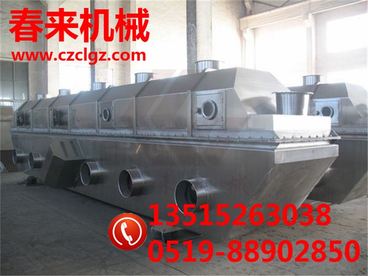 ZLG振動流化床幹燥機廣泛使用於化工、輕工、醫藥、食品、塑料、糧油、礦渣、製鹽、糖等行業的粉料的幹燥、泠卻、增濕等作業。物wu料liao自zi進jin料liao進jin口kou進jin入ru機ji內nei,在zai振zhen動dong力li作zuo用yong下xia,物wu料liao沿yan水shui平ping麵mian流liu化hua床chuang拋pao擲zhi,向xiang前qian連lian續xu運yun動dong,熱re風feng向xiang上shang穿chuan過guo流liu化hua床chuang同tong濕shi物wu料liao換huan熱re後hou,濕shi空kong氣qi經jing旋xuan風feng分fen離li器qi除chu塵chen後hou由you排pai風feng1:3排出,幹燥物料由排料進口排出。