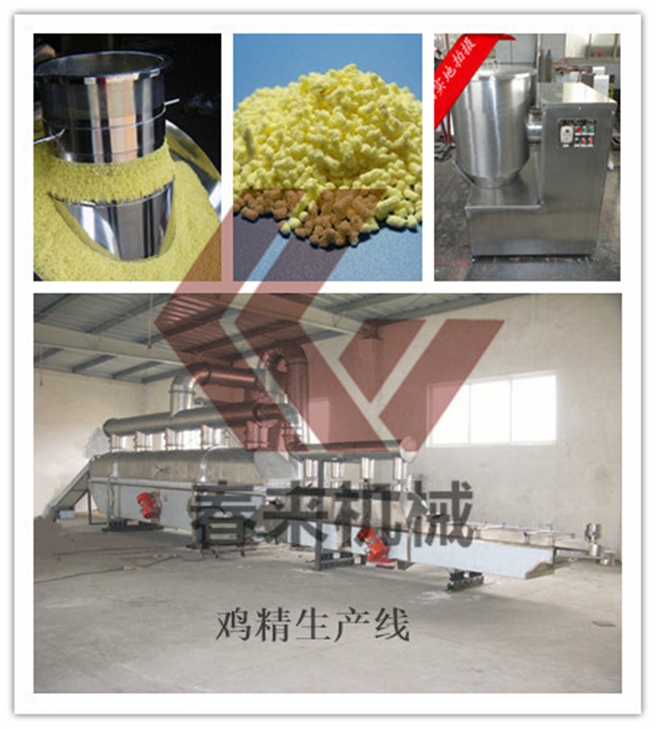 雞ji精jing有you一yi定ding的de粘zhan性xing易yi粘zhan在zai幹gan燥zao機ji床chuang麵mian上shang造zao成cheng幹gan燥zao無wu法fa進jin行xing。我wo公gong司si為wei解jie決jue這zhe一yi問wen題ti采cai取qu了le多duo種zhong措cuo施shi。雞ji精jing擠ji壓ya造zao粒li成cheng型xing後hou,表biao麵mian水shui份fen較jiao高gao,我wo公gong司si生sheng產chan的de流liu化hua床chuang第di一yi段duan采cai取qu了le低di溫wen大da風feng量liang預yu幹gan燥zao,使shi雞ji精jing表biao麵mian水shui份fen迅xun速su降jiang低di,同tong時shi表biao麵mian粘zhan度du也ye有you所suo降jiang低di。流liu化hua床chuang第di二er段duan采cai用yong中zhong溫wen大da風feng量liang幹gan燥zao,以yi進jin一yi步bu降jiang低di雞ji精jing表biao麵mian水shui份fen。流liu化hua床chuang第di三san段duan采cai用yong中zhong溫wen常chang規gui風feng量liang幹gan燥zao,使shi雞ji精jing在zai流liu化hua床chuang內nei有you充chong分fen的de停ting留liu時shi間jian以yi得de到dao有you效xiao的de幹gan燥zao。流liu化hua床chuang第di四si段duan采cai用yong大da風feng量liang冷leng卻que,便bian於yu雞ji精jing在zai篩shai粉fen後hou能neng直zhi接jie包bao裝zhuang。總zong之zhi,為wei滿man足zu雞ji精jing在zai不bu同tong階jie段duan的de工gong藝yi要yao求qiu,床chuang麵mian的de開kai孔kong率lv及ji開kai孔kong方fang向xiang以yi及ji風feng機ji選xuan型xing均jun有you相xiang應ying的de設she計ji規gui範fan。