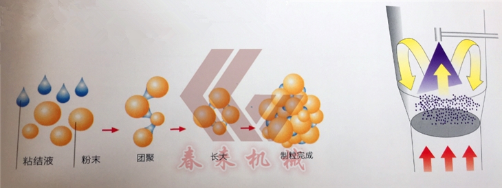 物料粉末粒子,在原料容器(流化床)中zhong呈cheng循xun環huan流liu化hua狀zhuang態tai,受shou到dao經jing過guo淨jing化hua後hou的de加jia熱re空kong氣qi預yu熱re和he混hun合he,將jiang粘zhan合he劑ji溶rong液ye霧wu化hua噴pen入ru,使shi若ruo幹gan粒li子zi聚ju集ji成cheng含han有you粘zhan合he劑ji的de團tuan粒li,由you於yu熱re空kong氣qi對dui物wu料liao的de不bu斷duan幹gan燥zao,使shi團tuan粒li中zhong水shui分fen蒸zheng發fa,粘zhan合he劑ji凝ning固gu。此ci過guo程cheng不bu斷duan重zhong複fu進jin行xing,形xing成cheng理li想xiang的de、均勻的多微孔球狀顆粒。