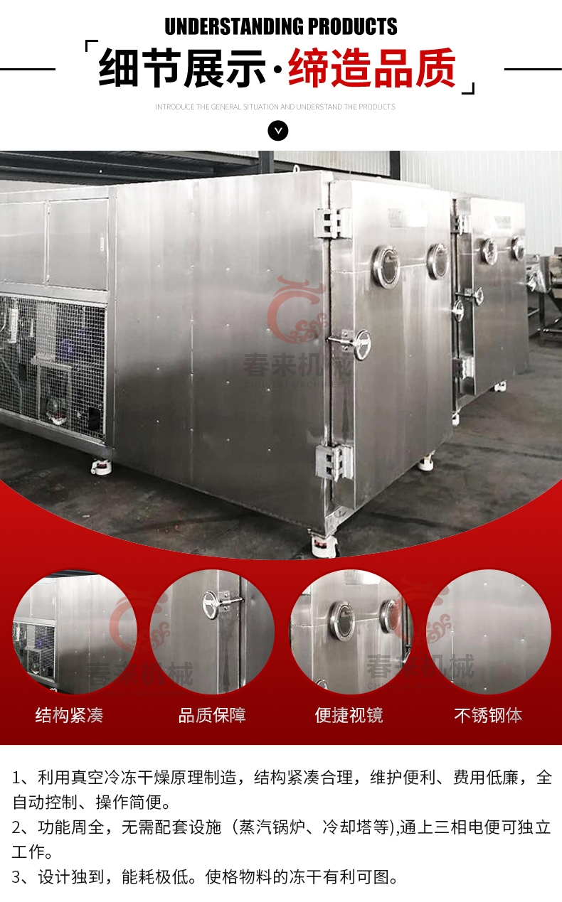 FD 凍幹機是在真空低溫環境下凍幹物料進行傳熱傳質的加工過程,應用範圍是非常廣泛的,隻要是含水、無毒、無腐蝕性的物質都可以運用凍幹技術將其製成凍幹品。幾乎所有的農副產品,如肉、禽、蛋、水產品蔬菜瓜果等都可以製成凍幹食品、調味品、速su溶rong食shi品pin等deng。真zhen空kong冷leng凍dong幹gan燥zao的de原yuan理li是shi基ji於yu水shui的de三san相xiang圖tu,在zai水shui的de三san相xiang點dian壓ya力li以yi下xia固gu態tai冰bing吸xi收shou升sheng華hua熱re而er成cheng為wei氣qi態tai,而er使shi物wu質zhi脫tuo水shui進jin行xing的de低di溫wen低di壓ya幹gan燥zao,故gu也ye稱cheng為wei冷leng凍dong升sheng華hua幹gan燥zao。能neng夠gou大da限xian度du的de保bao持chi原yuan有you食shi品pin的de色se、香、味、形及營養成分, 複水效果很好。