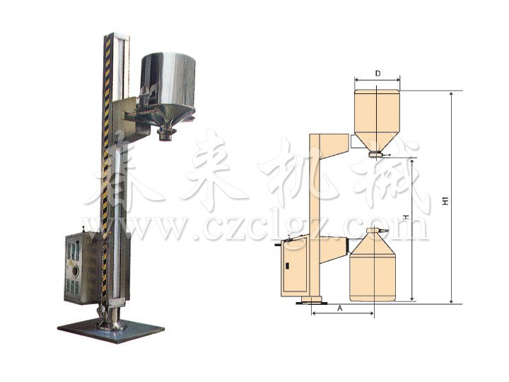 TJG 係列固定提升加料機由兩部分組成,即提升機及底座。提升機由機架、液ye壓ya提ti升sheng係xi統tong及ji料liao門men翻fan轉zhuan機ji構gou組zu成cheng。工gong作zuo時shi,先xian將jiang提ti升sheng機ji的de料liao門men與yu料liao桶tong扣kou合he,啟qi動dong提ti升sheng操cao作zuo杆gan,料liao門men與yu料liao桶tong一yi起qi上shang升sheng,啟qi動dong翻fan轉zhuan操cao作zuo杆gan,料liao桶tong即ji可ke番fan轉zhuan180度,呈底桶向上姿態並移動到所需位置,利用料門上出料蝶閥,可很容易將物料加入所需的工藝設備中。